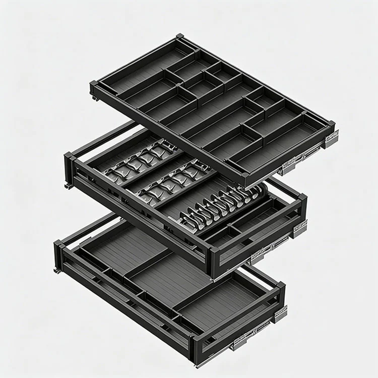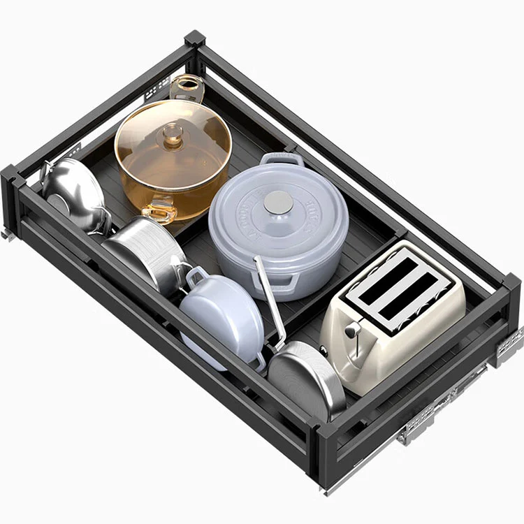 이 알루미늄 합금 풀아웃 바구니는 주로 접시, 냄비, 조미료와 같은 주방 품목을 분류하여 보관하는 데 사용되는 내장형 주방 보관 하드웨어입니다. 이 주방 캐비닛 서랍은 현대식 주방을 위해 특별히 설계된 내장형 수납 솔루션입니다. 레이어드 디자인과 실용적인 기능을 핵심으로 하여 지저분한 내부수납장과 낮은 수납장 공간 활용도의 문제를 손쉽게 해결하고, 주방수납에 탁월한 도우미입니다.