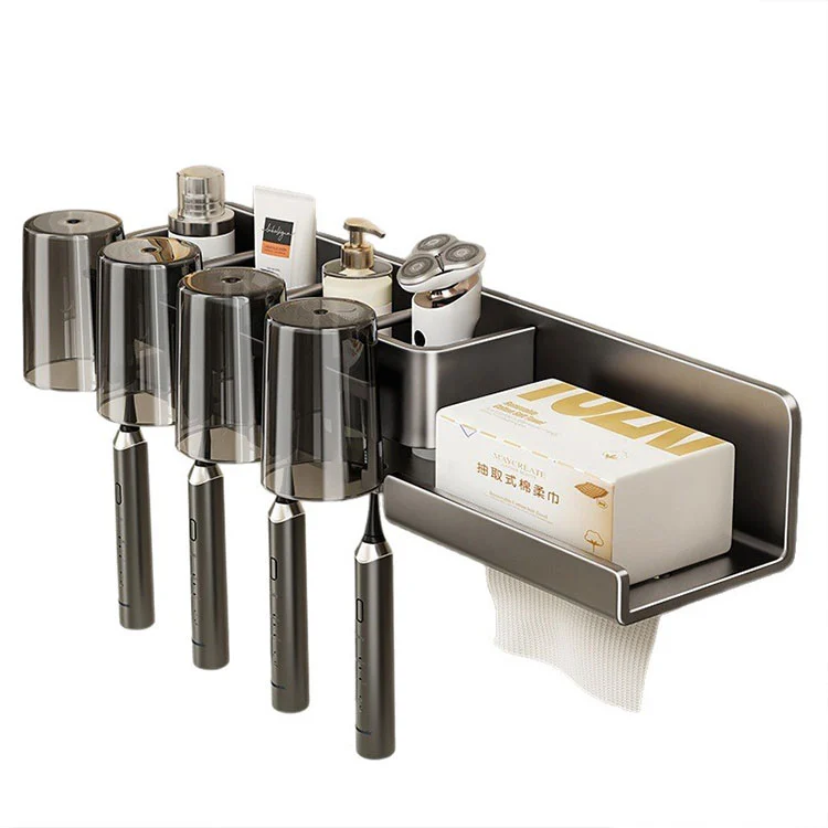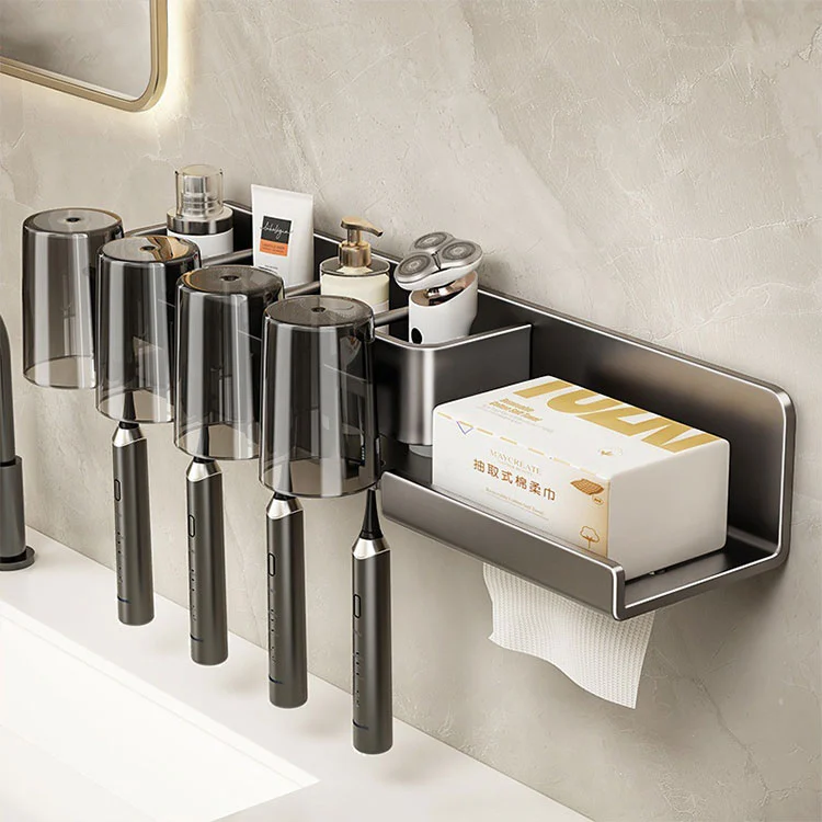 보관 공간: 오픈형 트레이를 사용하여 치약, 면도기 등 작은 물품을 보관할 수 있습니다. 반대편에는 티슈걸이가 있습니다.